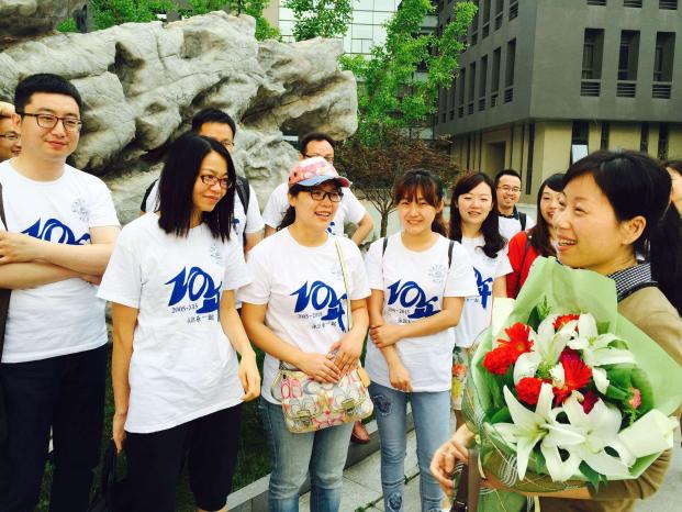 校友与许静书记和马珩老师一起,重温班会,并向老师献上鲜花,表达对老师最真挚的感谢和祝福。校友还向学院“玖基金”捐款一万元,作为在校学生的助力资金,以帮助在校学生更好的创业和发展。同时,0901502班与2013级会计专业在校生结成了校友导师班,以便更好地为学弟学妹提供同辈之间的专业解惑、职业生涯规划指导。校友还参观了学院大楼、院史馆、学院图书馆,并在老照片前寻找10年前自己的青春模样。
