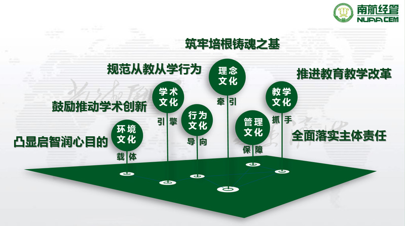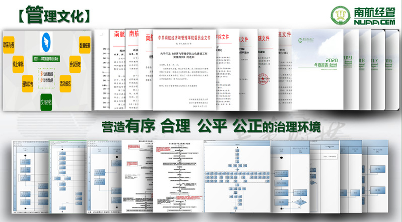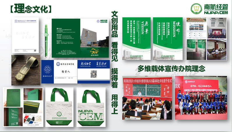 ——以理念文化为牵引,筑牢培根铸魂之基 作为一所从“改革开放”中走来的学院,学院文化理念始终与国家需求同向同行、同频共振。学院凝练确立了“成为一所根植于中国土壤具有国际竞争力的一流经济管理学院”的愿景、“尚德励学,筹策济世”的院训、“培育产业精英,贡献经管新知,共创永续发展”的使命。通过教师的入职教育、学生的开学与毕业典礼、“凤回巢”校友返校等重要时间节点,利用学院网站、官微、电子显示屏、院史馆等多维载体进行宣传,使得沉淀形成的这些办学理念入眼、入脑、入心、入行,成为全院师生的理想共识与行动纲领。设计开发以学习和办公用品为主的经管文化创意产品,让“可以带走的经管文化”,深入到全体师生、校友,使经管文化看得见、摸得着、用得上。