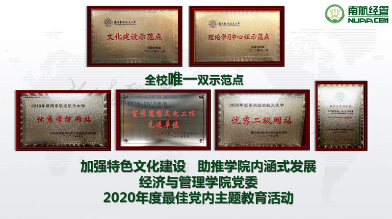 “十三五”期间,学院被评为学校宣传思想文化工作先进单位,获批校园文化精品项目、南航好新闻奖,学院网站连续两年获得全校优秀学院网站等荣誉称号,获全校首批学院文化建设示范点创建单位并于2020年获批校“文化建设示范点”,学院党委申报的 “加强特色文化建设,助推学院内涵式发展”被评为“2020年度最佳党内主题教育活动”。