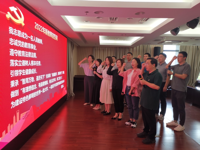 在新进教职工入职仪式上,刘传江教授带领11位老师在全院老师的见证下庄严宣誓将忠诚党的教育事业,落实立德树人根本任务,秉承“智周万物,道济天下”校训和“尚德励学,筹策济世”院训,做“四有”好老师,为建设特色鲜明的世界一流大学、一流欧美性爱