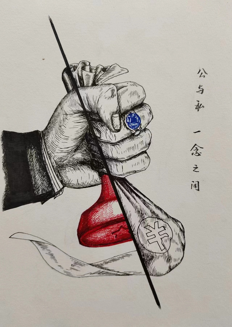 画面中间是一只手,左右分为两个部分,左半部分掌握着象征权力的公章,是为公;右半部分手持代表私欲的钱袋,是为私。中间是一道直线,象征着内心的底线、是最基本的原则红线。