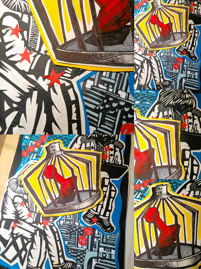 以蓝色为底象征南航,红色星星点缀代表红色梦想。刻纸画象征传统文化,寓意中华廉洁文化源远流长。最中间的显著的图案象征着将权力关进制度的笼子里,传递廉洁精神。最后,底面正在绘画的青年,寓意着描绘美好中国蓝图。