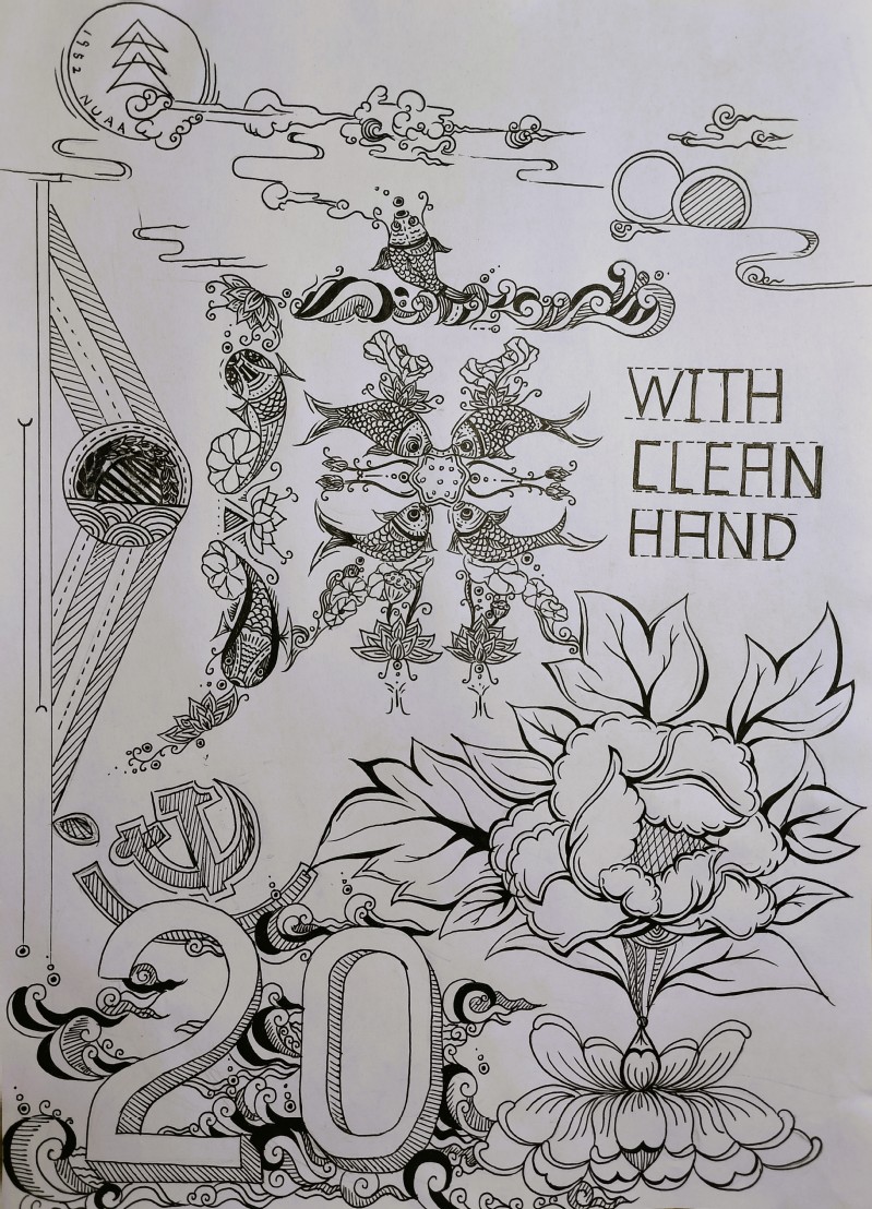 以廉政为主题,表达了以廉为荣。作品正中间为由鱼、莲、荷组成的“廉”字,右边为英文注释with clean hand。右下角莲花象征廉,左下角的“20”代表献礼党的二十大胜利召开。上方月亮带有南航元素,象征清廉南航建设。