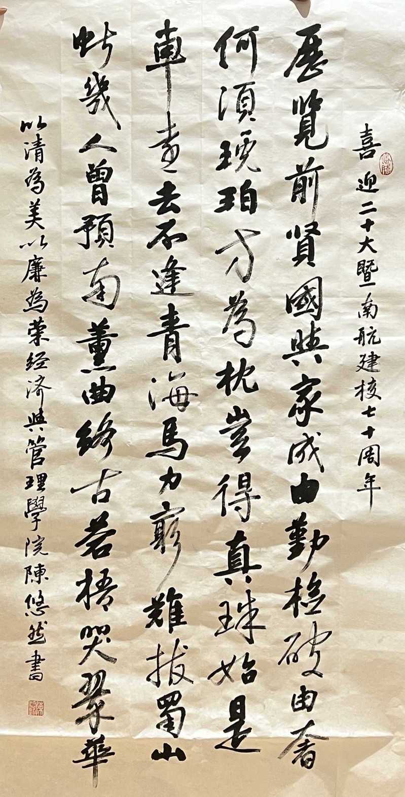 通过赞颂竹,坚定而含蓄地表达了“廉洁”的亮节志向。而竹所象征的君子之道,也正如科研工作者在学术研究上的风格,雅正、温和、谦恭、内敛而稳健。在我校七十年华诞之际,借此作品,也希望22级新生能拥有新“竹石”精神,以“功成不必在我,功成必定有我”之心,不畏风浪,敢于担当,为我校书写新征程!《兰作清品,竹是幽人》创作源于王羲之《兰亭序》,表达了一种高洁的志趣和情操。如同我校校训“智周万物,道济天下”,体现南航学子沉潜学问的大道理。