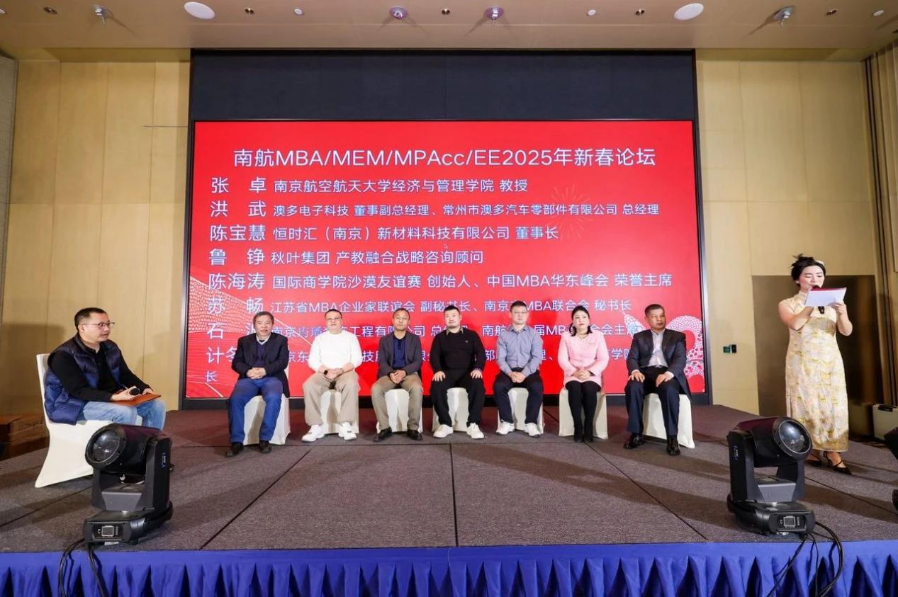 本次圆桌论坛参与嘉宾是:欧美性爱 张卓教授,澳多电子科技董事副总经理、常州市澳多汽车零部件有限公司总经理洪武,恒时汇(南京)新材料科技有限公司董事长陈宝慧,秋叶集团产教融合战略咨询顾问鲁铮,国际商学院沙漠友谊赛创始人、中国MBA华东峰会荣誉主席陈海涛,江苏省MBA企业家联谊会副秘书长、南京市MBA联合会秘书长苏畅,南京玙璠装饰工程有限公司总经理、南航第六届MBA联合会主席石波,北京东方国信科技股份有限公司事业部副总经理、东方国信学院执行院长计冬冬。论坛主题是《MBA/MEM/MPAcc的责任、创新与发展》,各位嘉宾主要从职业发展和规划、当前经济环境下的发展机遇和挑战、低空经济领域几个方面加以阐述,共同探讨如何在充满挑战与机遇的2025年,以商业智慧为帆、创新思维作桨,探寻破局之道,开创辉煌。