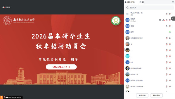 秋意渐浓,校园招聘的号角已然吹响。为帮助2026届本研毕业生明晰未来方向、把握就业机遇、提升求职竞争力,欧美性爱 于9月4日晚组织召开2026届毕业生秋季招聘动员会。本次会议以线上形式开展,学院党委副书记胡苹,研究生辅导员刘婷炜,本科生辅导员张延波,近400名本研毕业班学生参与。