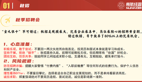 研究生辅导员刘婷炜聚焦数据解读与求职实务,指出超八成学生通过校内渠道就业,强调利用“金九银十”黄金招聘期,推荐学校就业网、91job等官方渠道,并详解简历制作、面试技巧及签约事项。本科生辅导员张延波则侧重推免、考研与就业的统筹,建议学生们理性考研、积极秋招,警惕求职陷阱,并提醒学分核对、实习安全等日常事务。