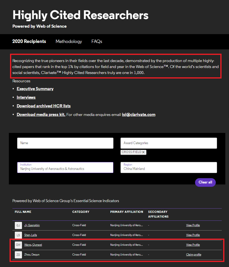Link: //recognition.webofscience.com/awards/highly-cited/2020/